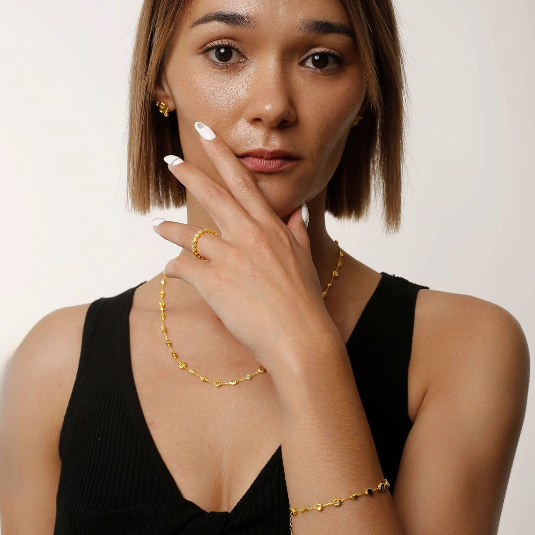 Imagina la brisa fresca soplando entre un ramo de jazmines... ¡Qué agradables son el olor y la suave caricia de la brisa sobre tu piel y cabello! Esta colección de joyería está diseñada para asociar este sentimiento con la joyería cada vez que la usas. El conjunto está inspirado en las flores de jazmín que crecen en primavera con un aroma encantador que te llega con la brisa que fluye.